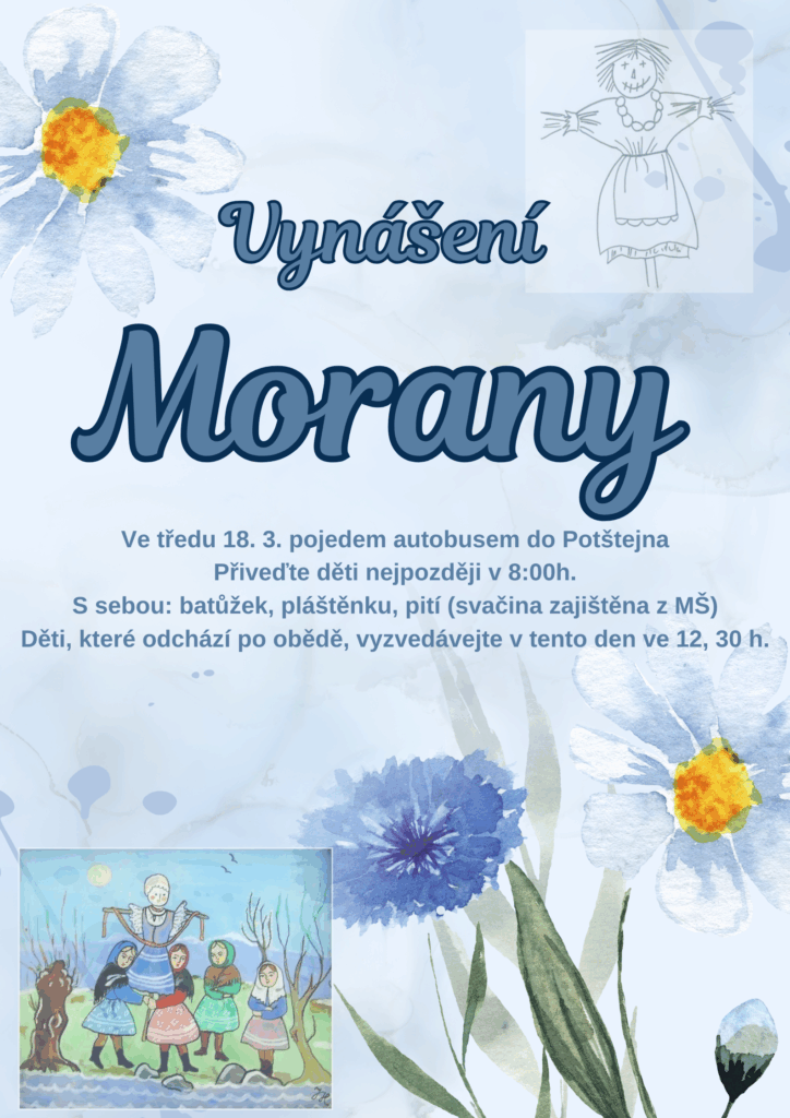 Ve středu 18. března pojedeme autobusem na vynášení Morany do Potštejna. Prosíme vás, abyste přivedli děti do školky nejpozději v 8:00 hodin. S sebou potřebují batůžek, pláštěnku a pití. Svačinu budeme mít ze školky.